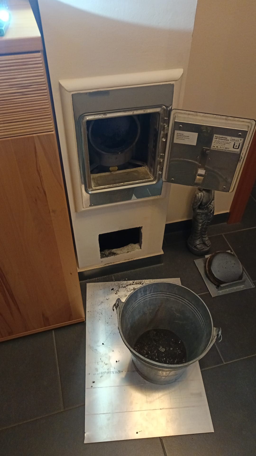 Vor Ort konnte dann zum Glück schnell Entwarnung gegeben werden. Es handelte sich nicht um einen Kaminbrand im "klassischen" Sinne, sondern im Bereich des Kondensatablaufs vom Kamin kam es zu einem kleinen Schwelbrand, bei dem das Rohr für den Kondensatablauf beschädigt wurde und in weiterer Folge zu Schmelzen begann. Wir entfernten das Rohr des Kondensatablaufs sowie die restliche Glut und Asche und kontrollierten die Bereiche rund um den Kamin mit der Wärmebildkamera.