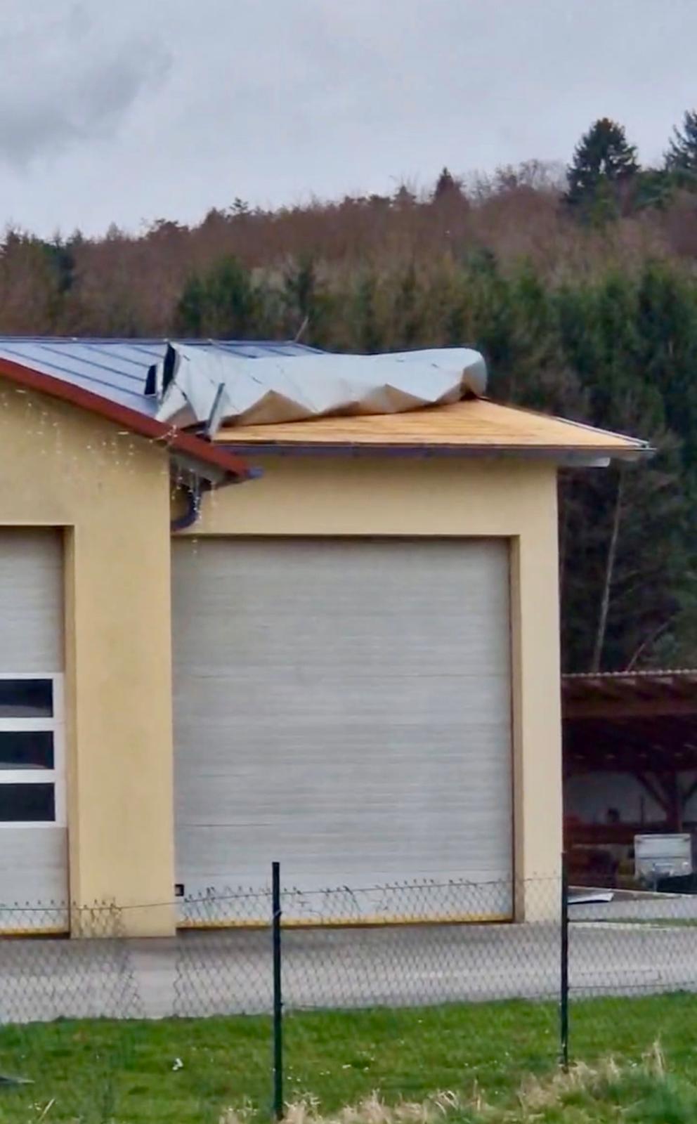 Nach wenigen Minuten rückten wir mit dem TLFA 4000 und 8 Kamerad*innen zum technischen Einsatz aus. Der Sturm zeigte sich von seiner aggressiven Seite und deckt einen Teil des Blechdaches vom Bauhof ab. Da das Dach zum Glück nur aufgebogen war, konnten wir dieses wieder zurückdrücken und mit Holzlatten sowie Sandsäcken fixieren. Wir bedanken uns an dieser Stelle bei Bernd Wagner für die Unterstützung mit seinem Teleskoplader, welcher uns die Arbeiten am Dach enorm erleichtert hat.