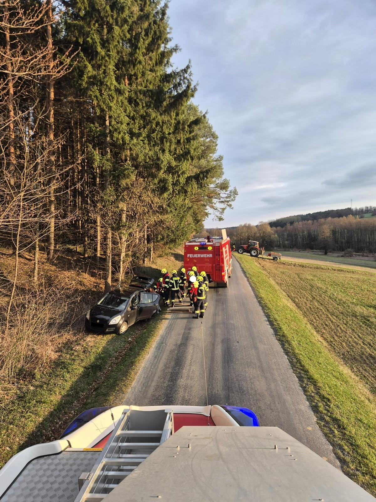Nach Absicherung der Unfallstelle wurden die Räder des Fahrzeuges mittels Pölzmaterial unterbaut, um ein Ausfahren des Fahrzeuges zu ermöglichen. Mittels Rundschlinge und Einsatz des TLFA 4000 zogen wird das Fahrzeug aus der misslichen Lage und die Fahrt konnte anschließend ohne Beschädigungen fortgesetzt werden.